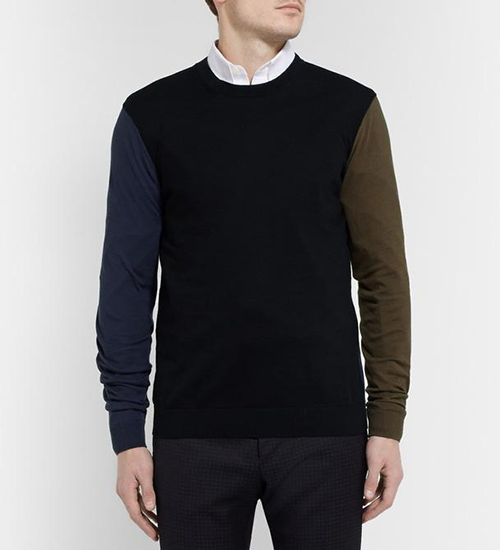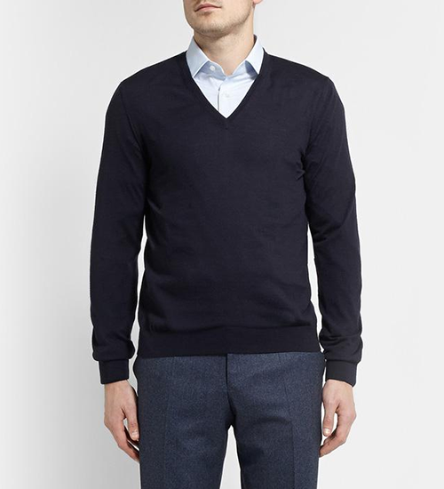 蓝色明车线装饰、长袖衬衫、深蓝色 V 领长袖毛衣(both from Prada)