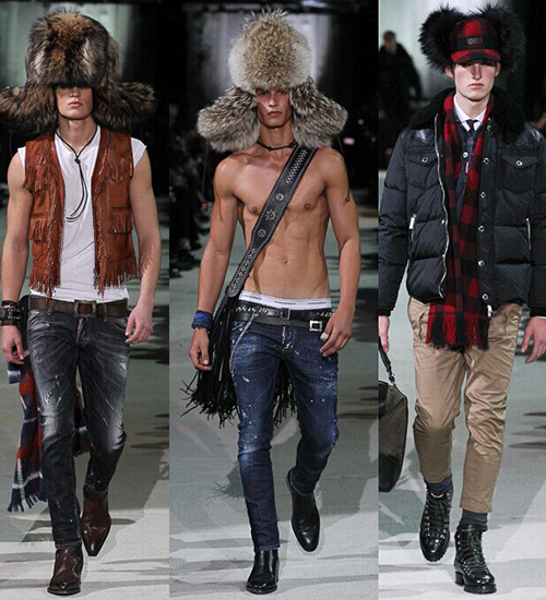 今年Dsquared2秀场大刮皮草风,夸张的加大号皮草帽时髦抢眼。将“雷锋帽”加以改良,深色系的皮草不仅可以为男士的硬汉形象加分,而且还可以兼顾保暖增加质感。